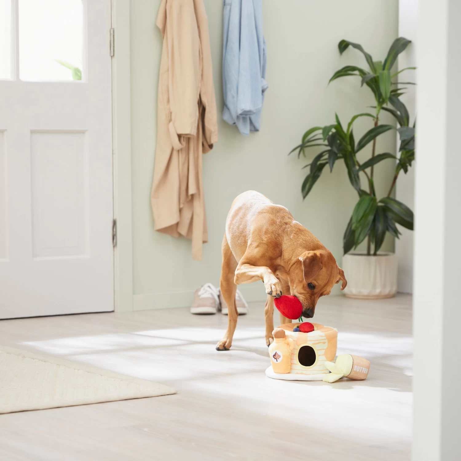 - Plush toy set comes with a pancake base and a strawberry, butter and maple syrup mini plush toys that you can stash and get your pup to retrieve for some hide-and-seek fun.